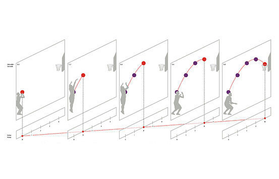 Von der Bewegung zur Kurve: Der Ball, den der Sportler wirft, „erschafft“ viele Funktionen, darunter diejenige, die seine Bewegung in der Horizontalen in der Zeit beschreibt.